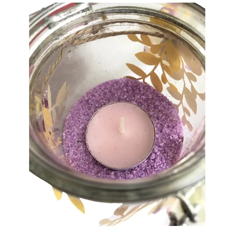 Ce bocal est décoré de sable coloré, de fleurs en tissu et de feuilles en papier découpées à l’aide d’une machine. Coloris disponibles : Orange ou violet