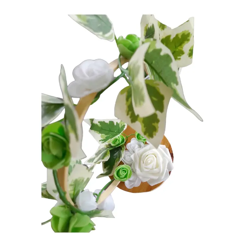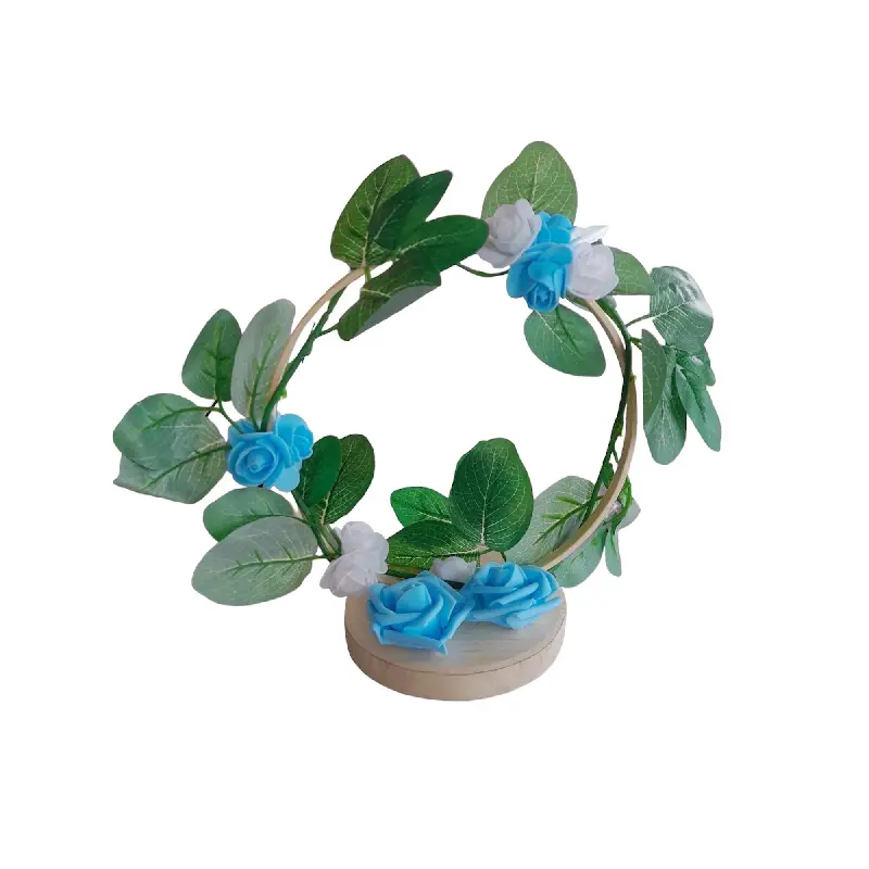 Ce cercle en bois est décoré de fleurs en mousse et d’un feuillage en tissu. Disponible en blanc et vert ou en bleu et blanc.