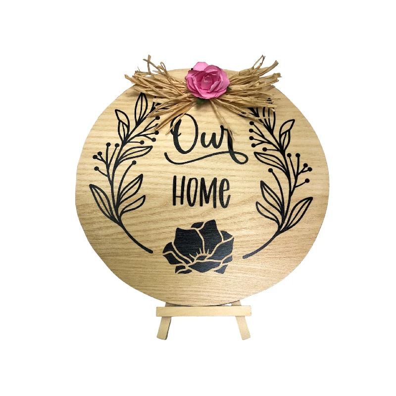 Ce cercle en bois est personnalisé « Our home » et est fait main. Celui-ci est posé sur son trépied.
