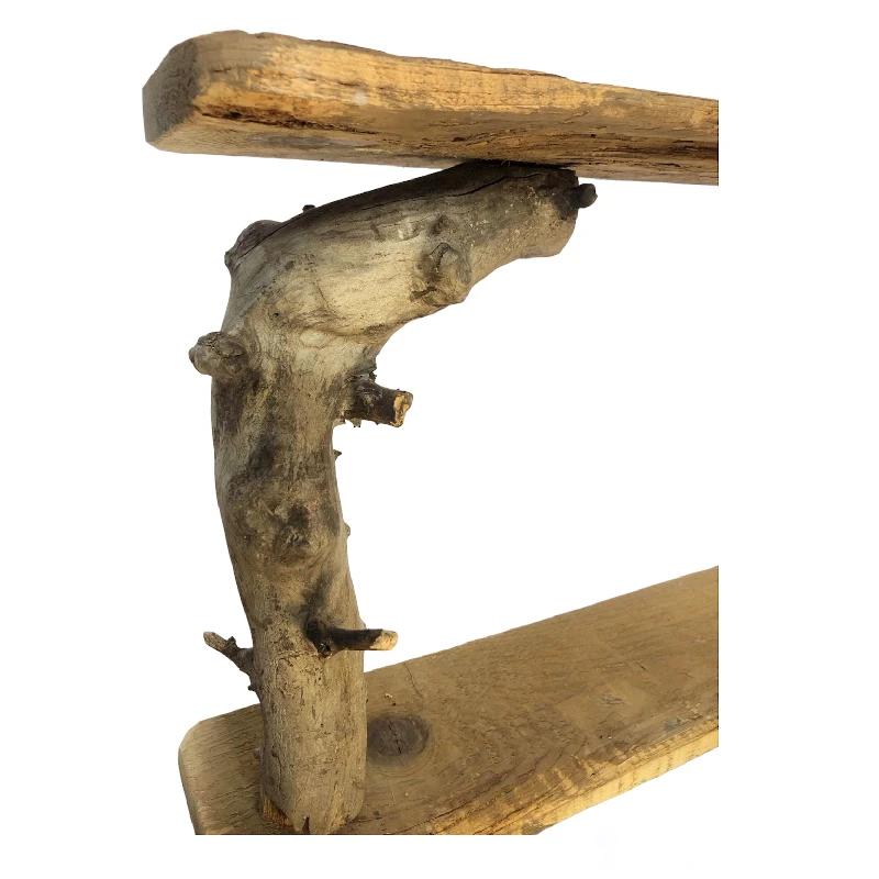 Étagère composée de planches de sapins vieillies et d’une branche de pommier.