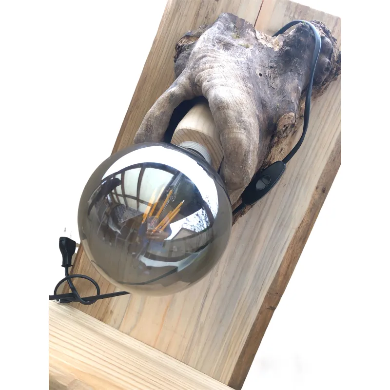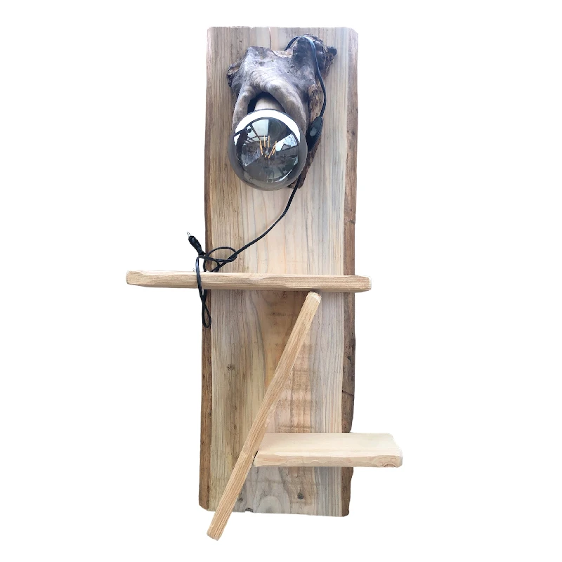 Cette étagère est faite en sapin échauffé avec une loupe de frêne. Originale grâce à sa grosse ampoule placée au centre de la loupe. A vous de choisir le sens de l’étagère : Ampoule en bas ou en haut.