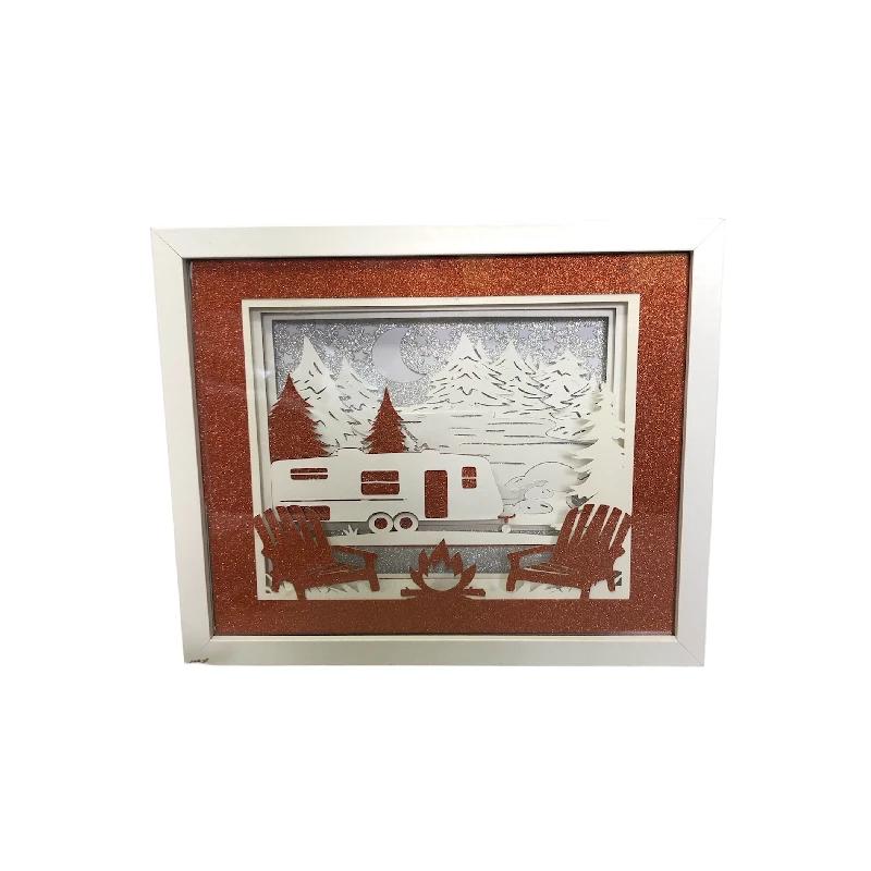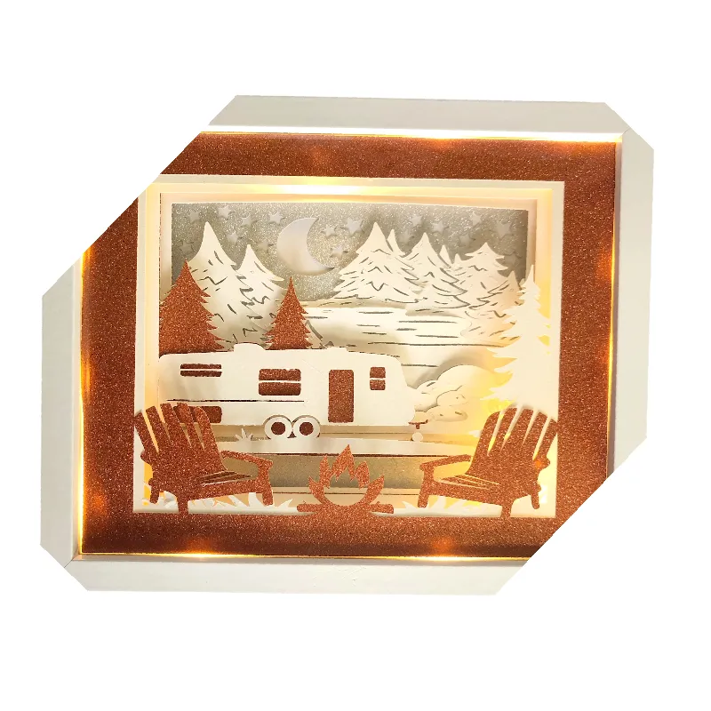 A l’intérieur d’un cadre blanc recouvert d’un verre protecteur, cette light box 3D est sur le thème des vacances (caravane, fauteuils, …). Une guirlande LED est cachée tout autour pour illuminer votre décoration.