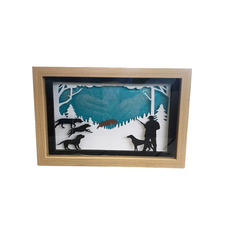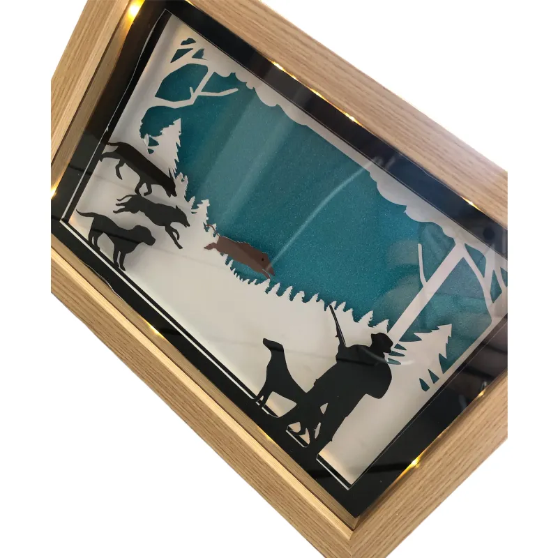 Cette light box au design 3D a été imaginée sur le thème de la chasse.