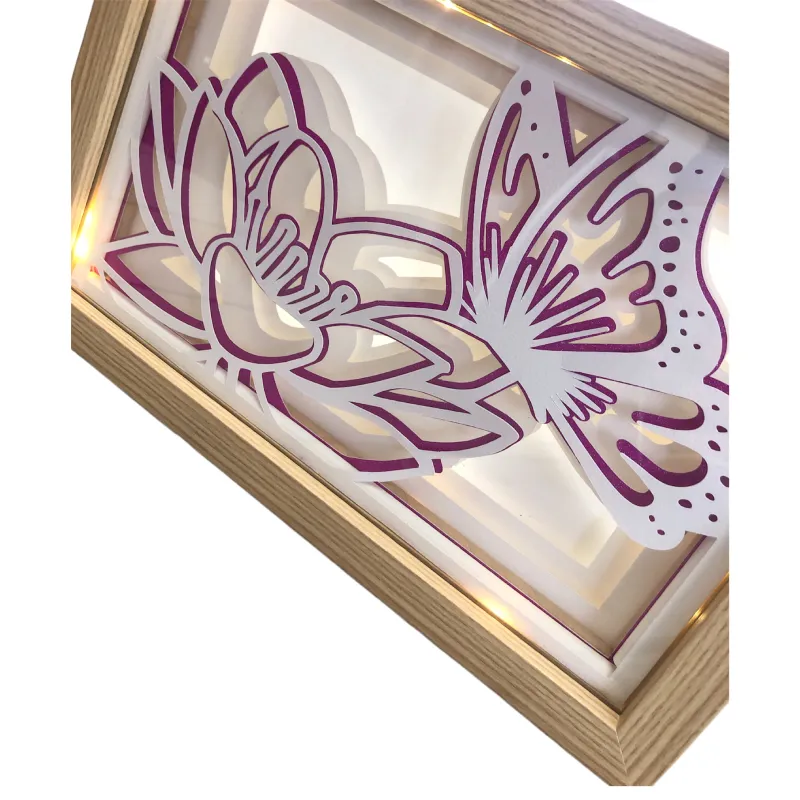 Light box pensée sur le thème de la nature. Une guirlande LED est cachée tout autour du cadre afin d’illuminer ce design 3D blanc et violet. Verre protecteur.