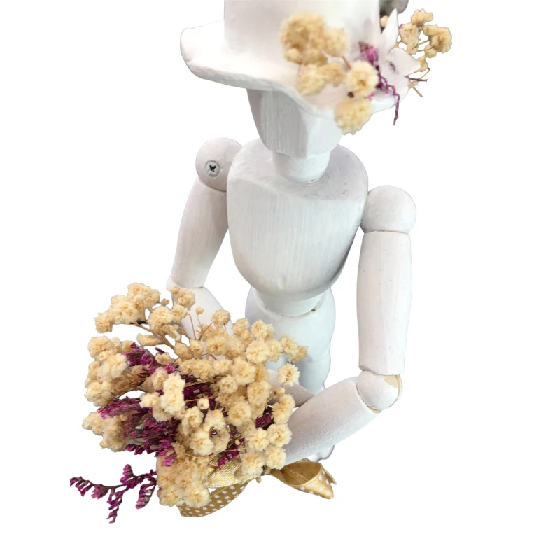 Ce mannequin peint en blanc tient un bouquet de fleurs séchées. Chapeau réalisé en argile autodurcissante.