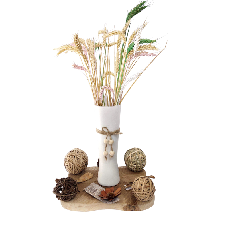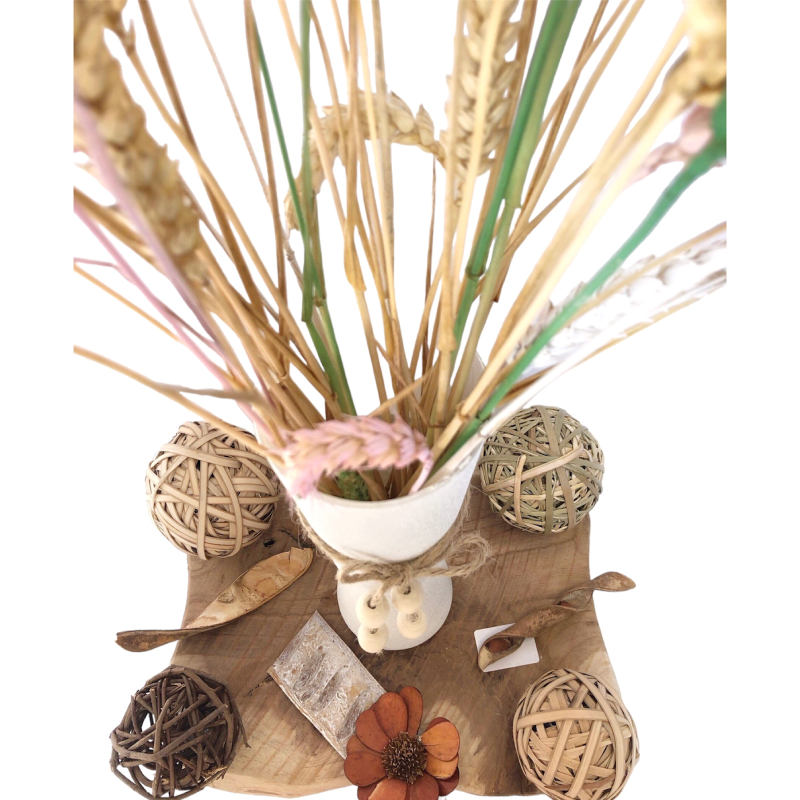 Ce plateau en bois est orné d’un mélange décoratif naturel et d’un vase en verre au centre. Idéal en centre de table ou décoratif. (Produit vendu sans le blé)