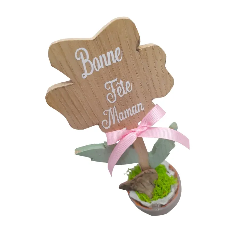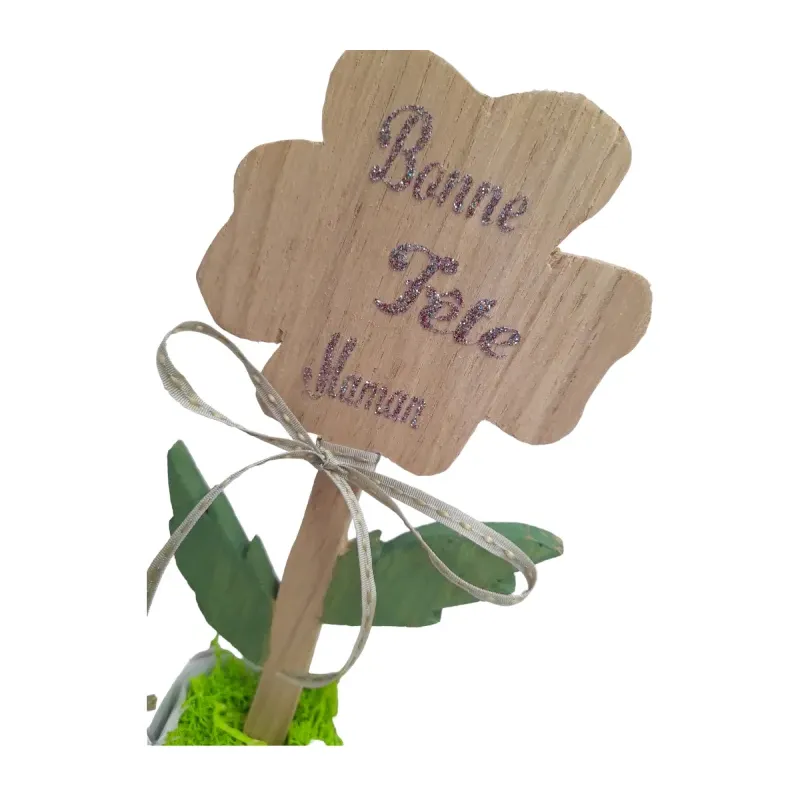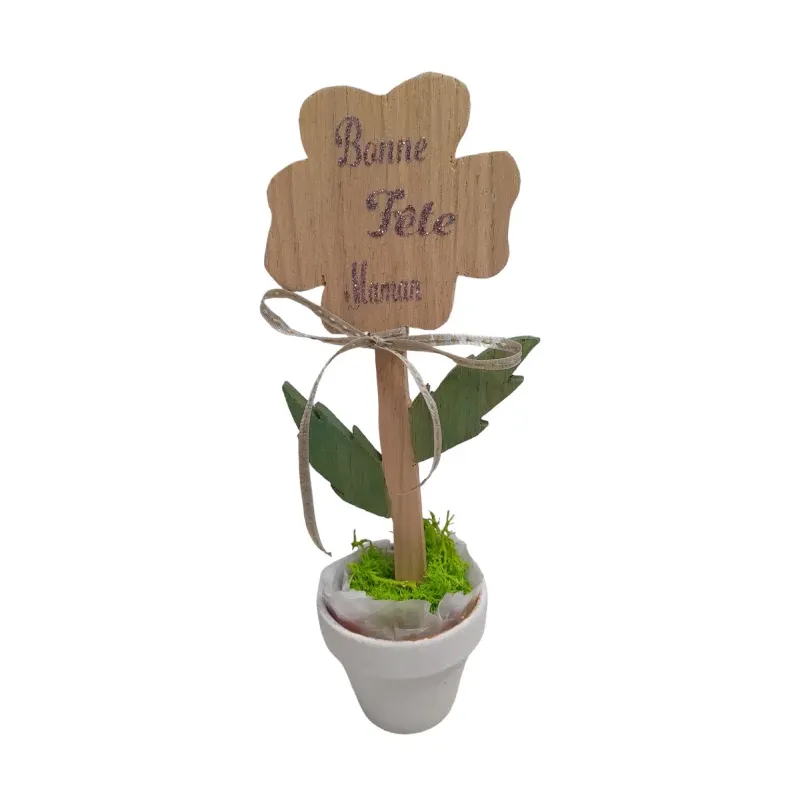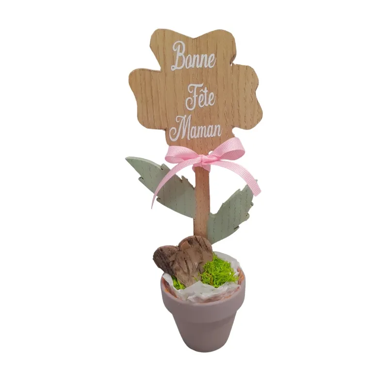 Ce petit pot de fleurs est personnalisé pour la fête des mères. En son centre, se trouve une fleur en bois réalisée entièrement à la main.