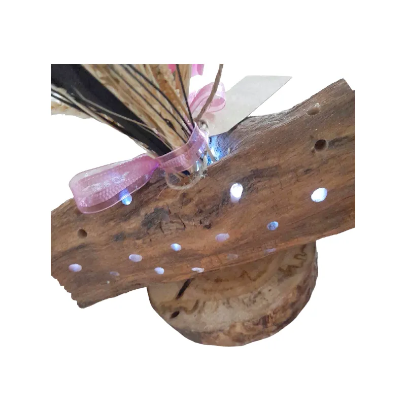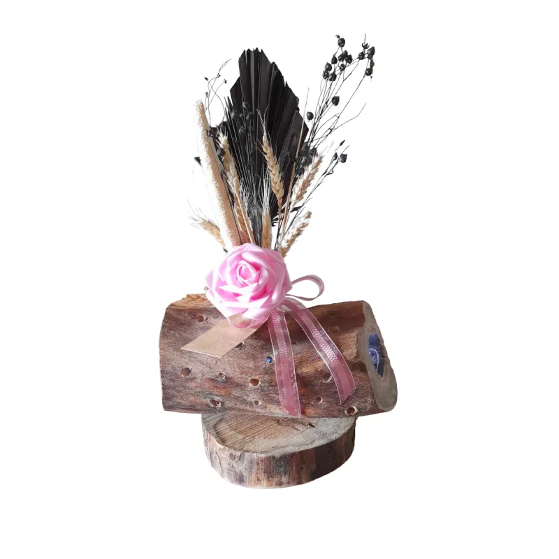 Ce rondin de bois est éclairé par sa guirlande glissée à l’intérieur. En son centre se trouve un bouquet de fleurs séchées et une rose en mousse.