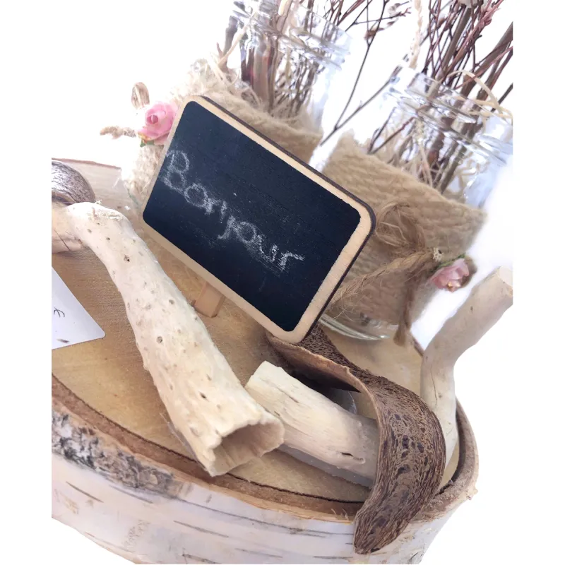 Retrouvez deux pots pour y glisser vos fleurs séchées ou fraiches sur cette rondelle de bois décorée. Les pots sont ornés de toile de jute. Une petite ardoise se trouve au centre pour y écrire le mot de votre choix. (Vendu avec un bouquet de fleurs séchées)